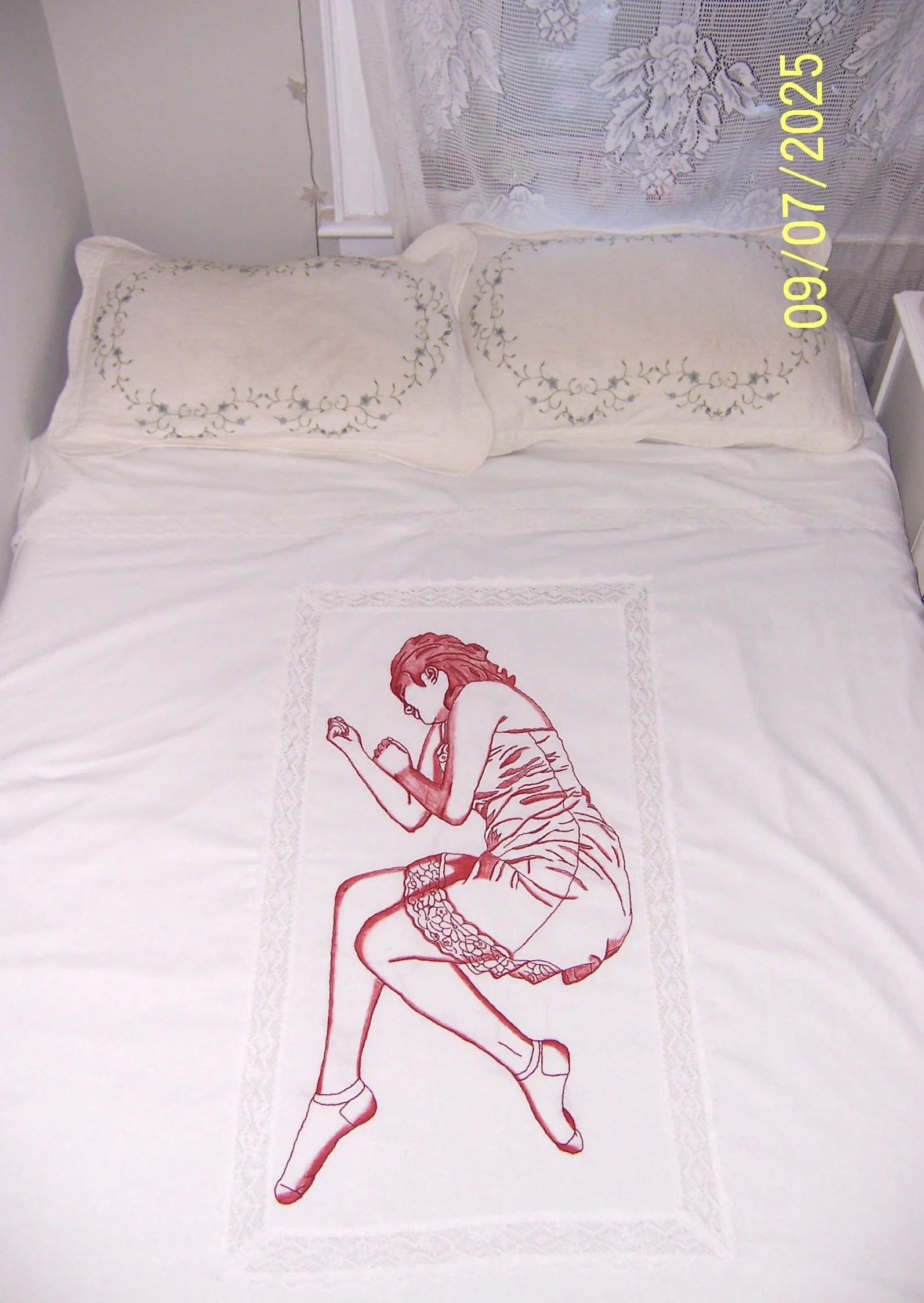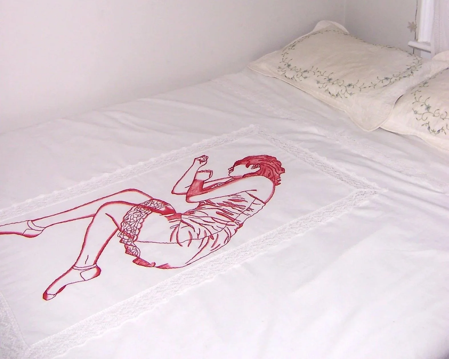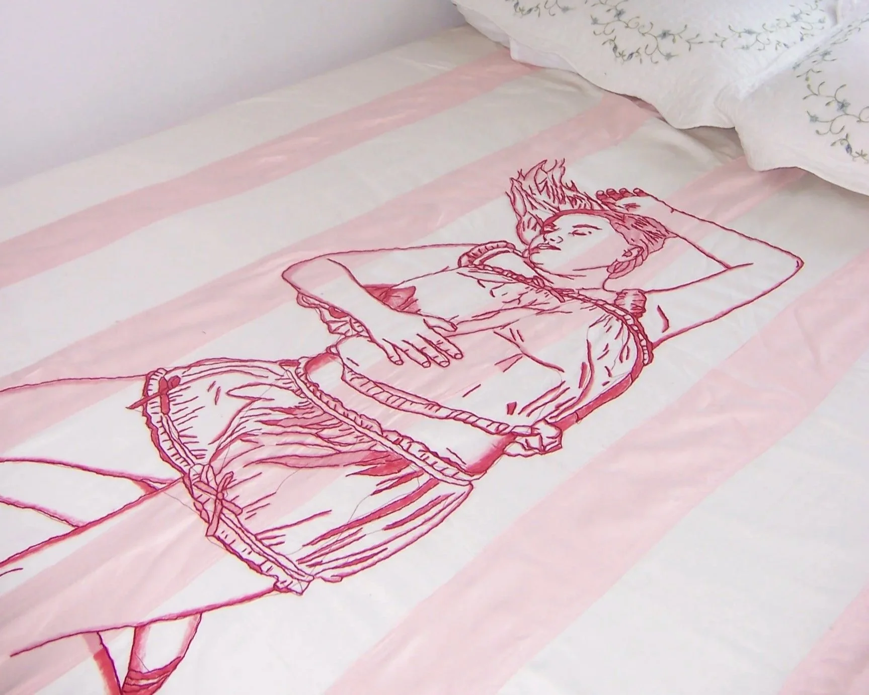 Sleeping Study 2. 2025. Fil, broderie et peinture sur coton. 140 x 190 cm.
